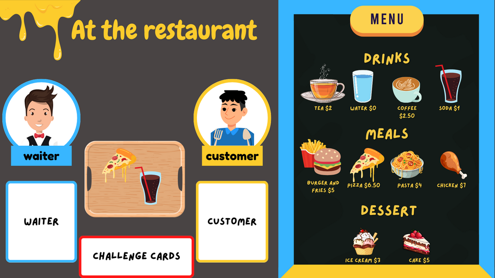 This interactive restaurant themed activity allows students to have fun while learning how to use everyday English to order different meals as well as enquire about cost of meals. The activity comes with dialogue cards to get the conversation started. For higher level students, there are additional scenario challenge cards. The vibrant colors and fun design is sure to excite your young learners.